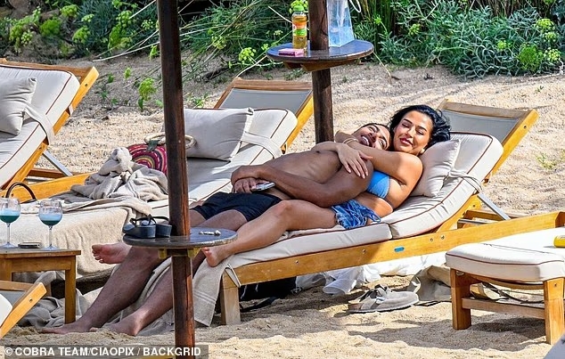 然而在海滩休憩时,两人却毫不掩饰地展现亲密姿态——不仅在蔚蓝海水中嬉戏追逐,更在躺椅上紧密相拥,始终十指相扣。