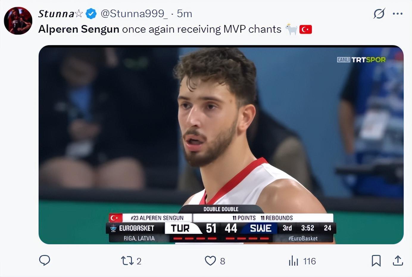 末节土耳其的防守专注度又有所下滑,而且瑞典队的超远三分连连命中,申京连续前场篮板帮助球队咬住分差,最后2分30秒申京被换下喘口气,还剩2分钟申京登场,决胜时刻申京统治比赛了,先是篮下自抢自投命中,随后摁帽一个,一攻一防引来全场高呼MVP。
